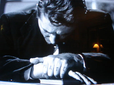 Ben’s secret catches the attention of the Preacher (Robert Mitchum), a switchblade-wielding, tattooed con man and sexual deviant. Preacher was Ben’s cellmate at the Penitentiary. Mitchum’s Preacher wears the words “Love” and “Hate” tattooed on the knuckles of each finger.