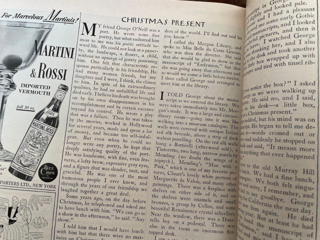 I’ve re-typed this story for everyone to enjoy, because our friends at the New Yarker don’t make their archives available unless you shell out for a subscription, which seems to go against what the holiday season means to me. Maybe they’ll demand I take it down eventually. I hope you enjoy it for a little while anyway. I’m going to read “Endymion” today, though I doubt I’ll understand it. I will also give thought to what object I would seek out that would give me as much profound joy as that manuscript gave George.
