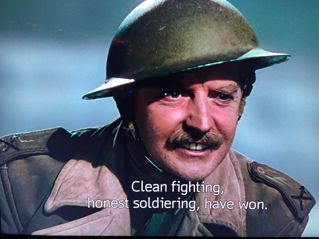 On the surface, the story, which is a rambling tale told over many, many years (it’s almost three hours long) is really how Good Old Englishness should stand up to the horrors and unfairness of modern warfare, and that sort of fairness is reflected in the Jolly Old English way of life, which is warm, and loving, and kind. This point is challenged at the start by a young soldier who points out that the Nazis don’t play fair, so why should we? We being the English. I agree that fair play and being upstanding are good. And the film celebrates good citizens and what it means to have a rich life.